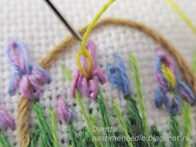 2) Выполнив все стежки, выполняем стебельчатым швом низ корзинки. В данном случае длина стежка - 4 нити основы.