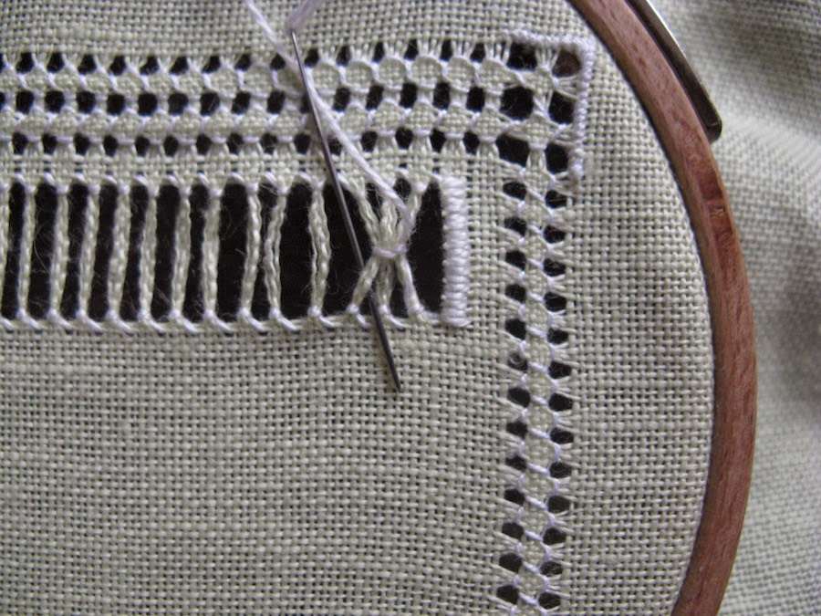 Все мережки в этом дизайне начинаются с мережки "столбик" на 4х нитях, то есть длинная сторона обрабатывается швом, захватывающим по 4 вертикальных нити ткани.